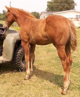 | at 11:50 pm. Cherry red sorrel colt with a small star and strip and no white feet. This one is going to look JUST LIKE his momma. He has the same build as her, the same shape in his head and face, the same attitude, it's like she cloned herself. He is sweet and spirited all at the same time and going to be one nice horse. His sire is Coltons Cowboy whose sire is Peppys Boy 895 by Peppy San Badger by a daughter of Maxi Lena by Doc O Lena. Cowboys sire and dam have a combined total earnings of over $130,000 themselves. Then his dam is San Jameen, our very own daughter of Mr San Peppy(AQHA Hall of Fame and NCHA World Champion, COA, Superior in Performance, 161 AQHA Points and over $107,000 in earnings) and is a grandaughter of Doc's Prescription (NCHA Money earner, ROM, 16 AQHA Points) and great grandaughter of Buddy Dexter (11 AQHA Points and sire of Cutter Bill)on the bottom. She has produced foals off of Smart Little Lena, Docs Oak, Freckles Floyd, SR Hallmarked, etc... AND she has produced NCHA money earners off of these stallions. We bought this mare in foal in 2004. She had had a foal every year before we bought her so we felt safe in purchasing an older mare. Then guess what? She did not cycle that year(2004) or the next year(2005). We finally got her to cycle in 2006 and this is what we got. We are so thankful for this little one. He is bright eyed and healthy and Jamie is feeling good and loving her new little one. We plan to keep him and hopefully promote him in a performance event when he is older. Click here to see his pedigree. |