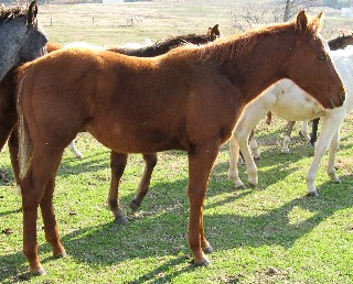 | Reno was orphaned on May 29th, 2007. His dam passed away within a few hours of her starting to show us signs of being uncomfortable, she went from a totally normal day, to being in some pain, to being in a lot of pain and finally she laid down and passed away. It all happened very quickly and within a few hours time. She will be missed;( We loved the old gal and hated to see her suffer at all. Reno seems to be fine and was already eating and drinking with her all the time. He will be barn kept for awhile until I get him halter broke, and then we will turn him back out to play with his buddies. He has been a trooper and we are so happy to have this one last foal off of Gen. |