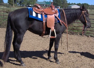 | New Pics of Ace while out on a trail ride posted in August of 2007. Click here to check them out. Doc's Peppy Ace- AQHA/NFQHA 90% 2002 Black Stallion that is a grandson of Mr. San Peppy. Yep, you've seen him born and grow up right here on the place. This is one that we researched, bred, and raised and it has been a long time coming to get him to where he is now. We are so excited to be expecting our first foals by him in 2007. His sire, Black to Basics, is the only black son of Mr San Peppy still living and he has won money and points in NCHA, ACHA, and AQHA. Was still being shown as a 14 year old by amateurs and non-pro cutters. Ace's dam is by Oak San Doc(NCHA money earner of $2,325) who won 15,000 in NCHA who was by Docs Oak(Hall of Fame, ROM, NCHA money earnings of $70,000+, sire of World Champion Offspring, Superior Performers, NRHA and NCHA money earners). His pedigree also contains Leo San, Continental King, Joe Bailey, Doc Bar, Peppy San, Gay Bar King, and Leo. Both his sire and dam are non-fading black so he should make a great cross in order to get black and buckskin foals. He rode and performed well in cattle events as you can tell by the pics on his picture page and we pulled him out of training so that he could start his career as a herd sire for us. Ace is unconditionally quiet and kind. No ones knows that he is a stallion and he runs in the pasture with our riding geldings year round. We pull him out only to cover a mare and then put him right back. How many stallions out there do you know with this temperment?? Stud Fee for 2007 is $400.00 with a live foal guarantee. |