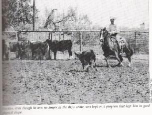 Rey Jay (STORY) by Larry Thornton The story of Rey Jay's contribution to the Quarter Horse begins with his overcoming a handicap that allowed him to compete and out perform many of the industry's elite cutting horses. Rey Jay sustained an eye injury as a weanling that impaired the vision in his right eye. It is believed that when the eye was irritated and inflamed that he could see about 15% of his normal vision. This handicap became a trade mark of Rey Jay's desire to succeed as a cutting horse, earning him a place in cutting horse history. Rey Jay proved his value as a show horse and this allowed him to enter the stud and prove himself as a sire. This has lead to a demand for the blood of Rey Jay in the modern cutting horse. Rey Jay has supplied that blood as the sire of outstanding foals, especially through his daughters. His daughters have produced such horses as Colonel Freckles, Freckles Playboy, Freckles Hustler, Jay Freckles, Lenas Success, Si Olena, Tamulena, Dox Lena Rey, Dox Abilena, Dox Alex, and Storks Gin. Rey Jay was bred by the King Ranch and foaled in 1955. He started life by traveling Texas before settling in Indiana. The King Ranch sold Rey Jay to Lloyd Jenkins. Ira White reportedly traded two Holstein calves for Rey Jay. White then sold Rey Jay to Curley Talamage. Talamage sold Rey Jay to Tom Lee of Fort Wayne, Indiana in 1959. In Patricia Close's story, "Rey Jay,The One-Eyed Cuttin' Horse" (WESTERN HORSEMAN, June 1965), Lee is quoted telling his first impression of Rey Jay. "That's the greatest prospect I've seen and I'm going to buy him." Lee added, "My Dad never questioned my judgment in getting the horse. He only said, "That's a lot of money for a one-eyed horse!" Tom Lee and Rey Jay went on to put the elder Lee's concerns to rest with a very good show record. Rey Jay earned his AQHA Championship, an AQHA Superior in cutting and the NCHA Bronze Award. They earned 257 cutting points, 12 halter points and 4.5 western pleasure points in the AQHA. Tom Lee became friends with Buster Welch. Welch's name is synonymous with many outstanding cutting horses. They include the great Mr San Peppy , Peppy San Badger, Dry Doc, Marion's Girl and Chickasha Mike. The Lee and Welch friendship would eventually lead to Rey Jay's permanent return to Texas. Tom Lee was severely injured in a horse accident and was unable to continue his showing and training activities. After the accident, Tom's wife Delight continued to show Rey Jay. In a 1985 interview, Buster Welch talked about Tom Lee with a great deal of respect and admiration. He credited Lee with doing an excellent job of training Rey Jay. His high regard for Lee was expressed when he called Lee "a real horseman" that could have been one of the great cutting horse riders and trainers had the accident not ended his career. With the accident making it impossible for Tom Lee to continue his riding and training, a decision was made to sell Rey Jay. It was Buster Welch that recommended Rey Jay to Marion Flynt and this is how the horse found his way back to Texas. Flynt was known to many in the cutting industry as "Mr Cuttin' Horse" because of his long time association with the NCHA. Flynt served as NCHA President from 1956 to 1958 and from 1963 to 1971. Buster Welch and Marion Flynt had what Welch termed a "wonderful and long association" as trainer and owner. Welch had trained and ridden Flynt's legendary mare Marion's Girl to the 1954 and 1956 NCHA World Championships. Welch clearly remembers his first encounter with Marion Flynt. "The first time I met him, I was about 16 years old. I was breaking a string of horses for Bob Hill of Midland, Texas. These horses ran from four to nine years old. We were coming out of the war and a lot of people had let their horses go. Marion came out and bought five horses for his ranch." Welch continued, "Mr. Hill had promised to let me pick a horse out in our trade and have him for $100.00. I had picked a brown horse that was a real pretty horse. A six year old horse. Well Marion saw him and insisted that he get that horse in the five. So Mr. Hill sold him the horse. The sad part is that that horse would up killin' a fella named Buck Underwood that was workin' for Marion. It was a roping accident. I didn't see Marion for a long time after that. Then I got into the cuttin' horse thing with him." By the time Rey Jay went back to Texas, he was experiencing problems with his hocks. Welch confirmed that the horse was experiencing pain and showed his ability "only when he felt good." Flynt used Rey Jay as a sire until the leg problems became too severe. He gave the horse to Texas A&M University, hoping they could help the horse with his physical problems. Eventually, the leg problem forced them to put the gallant one-eyed horse down. Rey Jay's bad eye may account for some of his success as a cutting horse. Welch describes the horse this way, "Rey Jay got real low to the ground. He had a lot of style for a horse in his day. I think some of it was that he had a lot of cow and that bad eye. He tried so hard to keep a cow under control, where he could see her. That gave him a little extra animation. There's not a whole lot of horses that would look at a cow as hard as he would, concentrate as hard as he did." By examining Rey Jay's pedigree, one can readily see where the potential for his ability and desire came from. Rey Jay traces four times to Old Sorrel through his sire, Rey Del Rancho and his dam, Calandria K. Old Sorrel was the foundation sire of the King Ranch Quarter Horses. Old Sorrel was bred by George Clegg, a noted breeder of early quarter horses. The sire of Old Sorrel was Hickory Bill. Hickory Bill was sired by Peter McCue. The dam of Peter McCue was Nora M., a Thoroughbred mare by Voltigeur. The sire of Peter McCue was Day Tucker by Barney Owens. Barney Owens was sired by Martin's Cold Deck by Old Billy. Old Billy was sired by Shiloh and out of Ram Cat by Steel Dust. The dam of Dan Tucker was But
