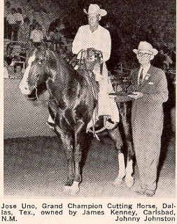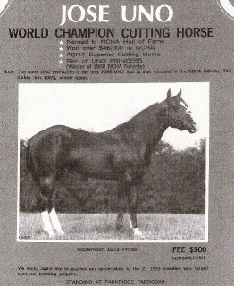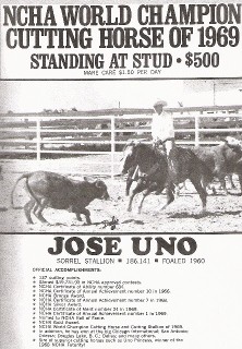 Jose Uno 1960; Sorrel; Joe’s Last x Shov Zan Stallion Show Record Hall of Fame, NCHA World Champion, '69 NCHA O Superior Performance, '66 O ROM Performance, '64 O NCHA money-earner Performance Point Earner Perf Points: 141; Perf Events: CUT; NCHA Earnings: $44,571; Stallion Offspring Record World Champion Offspring Top Ten World Show Offspring, NCHA Superior Performance Offspring AQHA High Point Performance Offspring AQHA Reserve High Point Performance Offspring ROM Performance Offspring NCHA Money-earners Performance Point Earners AQHA Offspring Record Total Points Earned: 282; Reg Foals: 234; Number Shown: 56; Point Earners: 28; Performance Points Earned: 282; Performance Point Earners: 30; Performance ROMS: 7; Superior Performance Awards: 1; Total Superior Awards: 1; Total ROM's: 7; World Championships: 1; Equi-Stat Cutting Offspring LTE: $341,638 Number of NCHA Offspr: 25 Avg Offspr CUT Earnings: $13,666 AQHA Offspr NCHA LTE: $383,382 Other Information '66 & '67 NCHA Top Ten members; NCHA Hall of Fame member; Stallion Rankings - A Top Stallion Ranked By: • All-Time Offspring Lifetime Cutting Earnings • All-Time Offspring Lifetime Average Cutting Earnings
