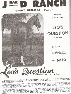Leo's Question 1951; Chestnut; Leo x Questionaire's Miss Stallion Show Record ROM Performance, '54 RC NCHA money-earner SI: 85; Race: $2,046; Wins: 4; Win Names: '54 2nd KS QHA Derby-$373; '53 2nd KS Futurity-$488; NCHA Earnings: $17; Stallion Offspring Record Superior Halter Offspring Superior Performance Offspring AQHA Champion Offspring ROM Performance Offspring Race ROM Offspring NCHA Money-earners Race Money-earners Halter Point Earners Performance Point Earners AQHA Offspring Record Total Points Earned: 1,068.5; Reg Foals: 273; Number Shown: 75; Point Earners: 41; Halter Points Earned: 202; Halter Point Earners: 13; Superior Halter Awards: 1; Performance Points Earned: 866.5; Performance Point Earners: 43; Performance ROMS: 14; Superior Performance Awards: 3; AQHA Champions: 4; Total Superior Awards: 4; Total ROM's: 14; Race Earnings: $53,001; Stakes Winners: 4; 90+ ROMS: 3; Race ROMS: 6; Superior Race: 1; Race Offspring Wins: 58; Equi-Stat Cutting Offspring LTE: $138,674 Number of NCHA Offspr: 13 Avg Offspr CUT Earnings: $10,667 AQHA Offspr NCHA LTE: $322,470 Outstanding Offspring Baldy Pete, $31,190 Race War Leo, 72 HLT & 192 Perf Pts; AQHA Champion, Superior HLT & CUT Stallion Rankings - A Top Stallion Ranked By: • All-Time Offspring Lifetime Average Cutting Earnings