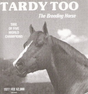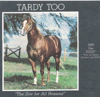 Tardy Too 1965; Sorrel Mains Leo Buck x Pretty Plush Stallion Show Record ROM Performance, '68 O Halter Point Earner Performance Point Earner Total Points Earned: 20.5; Halter Points: 14; Perf Points: 6.5; Stallion Offspring Record World Champion Offspring Reserve World Champion Offspring Superior Halter Offspring Superior Performance Offspring AQHA Champion Offspring ROM Halter Offspring ROM Performance Offspring NRHA Money-earners NCHA Money-earners NSBA Money-earners NRCHA Money-earners Halter Point Earners Performance Point Earners AQHA Offspring Record Total Points Earned: 6,587.5; Reg Foals: 628; Number Shown: 200; Point Earners: 150; AQHA IF: $11,896; Halter Points Earned: 2,920.5; Halter Point Earners: 143; Halter ROMS: 1; Superior Halter Awards: 19; Performance Points Earned: 3,667; Performance Point Earners: 155; Performance ROMS: 73; Superior Performance Awards: 18; AQHA Champions: 8; Total Superior Awards: 37; Total ROM's: 74; World Championships: 8; Res World Championships: 5; NRHA Offspr LTE: $638 Equi-Stat Cutting Offspring LTE: $1,373 AQHA Offspr NCHA LTE: $1,373 AQHA Offspr NRCHA LTE: $2,251 Equi-Stat Offspr WCH LTE: $193 Number of WCH Offspr: 1 Avg Offspr WCH Earnings: $193 AQHA Offspr NSBA LTE: $26,140