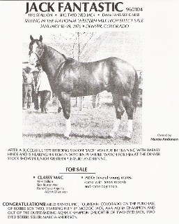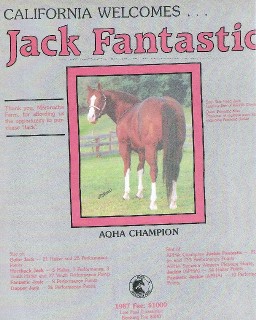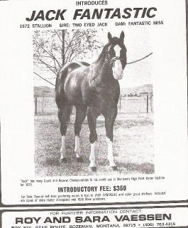 Jack Fantastic 1972; Sorrel; Two Eyed Jack x Fantastic Miss Stallion Show Record AQHA Champion, '80 ROM Performance, '76 O Halter Point Earner Performance Point Earner Total Points Earned: 43; Halter Points: 17; Perf Points: 26; Stallion Specialties: Halter, All Around, Western Pleasure