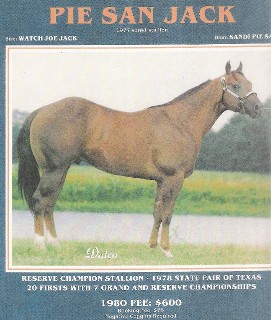 Watch Joe Jack 1970; Chestnut; Two Eyed Jack x Watch Jo Moore Stallion Show Record Top Ten World Show, '76 3rd Aged; '76 8th Sr HD Superior Halter, '72 O Superior Performance, '73 O WP AQHA High Point Performance Horse, '73 O WP AQHA Champion, '73 O ROM Performance, '73 Halter Point Earner Performance Point Earner Total Points Earned: 426; Halter Points: 225; Perf Points: 201; Perf Events: Sr. HD, WP; Stallion Offspring Record World Champion Offspring Reserve World Champion Offspring Superior Halter Offspring Superior Performance Offspring AQHA Champion Offspring ROM Halter Offspring ROM Performance Offspring Race Money-earners Halter Point Earners Performance Point Earners AQHA Offspring Record Total Points Earned: 7,345; Reg Foals: 1,542; Number Shown: 271; Point Earners: 208; AQHA IF: $55,961; Halter Points Earned: 1,964.5; Halter Point Earners: 122; Halter ROMS: 1; Superior Halter Awards: 8; Performance Points Earned: 5,380.5; Performance Point Earners: 232; Performance ROMS: 103; Superior Performance Awards: 28; AQHA Champions: 9; Total Superior Awards: 36; Total ROM's: 104; World Championships: 5; Res World Championships: 7; High Point Wins: 4; Race Earnings: $220; Other Information #15 AQHA All-time leading sires by # of registered progency. Watch Joe jack is a 1970 chestnut Quarter Horse. His AQHA # is 0729175 and he died in 1989. He had a total 225.0 halter points and 201 performance points. He was an AQHA Champion, Superior Halter & Western pleasure. Points: 225 Halter, 4 Western Riding, 149 West Pleasure(Superior), 1 Reining, 28 Team Roping-Heeling (ROM) ,18 Team Roping-heading(ROM). He is the sire of 1542 offspring. 245 were shown with 121 point earners; 9 AQHA Champions, 94 ROM Arena, 3 World Champions, 3 Amateur World Champions, 22 World Show placers, 3 Youth World Champion placers, 121 halter point earners with 1,964 pts., and 208 working point earners with 5,387 pts.