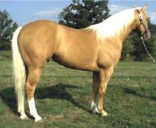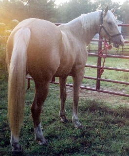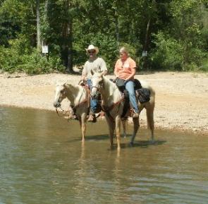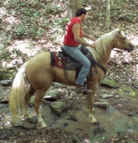 | Pic below is of 2 of Lucky's Offspring, Ima Peppy Outlaw and Lucky Genuine Cowboy, at Buffalo River Campground in TN in May of 2005. As you can see they make excellent laid back riding horses. |