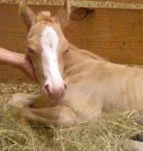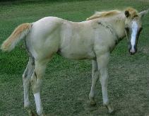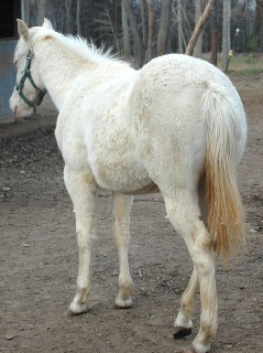 | Pics below are of Luckys Hustler a 2002 Cremello Stallion by Lucky who made a finished cutter . We purchased Hustler back in spring of 2010 and have gelded him. He is going to make us a riding horse. |
