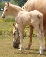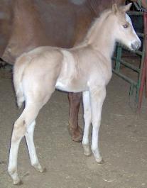 | This is an example for all the folks who want that colored foal and don't think that they shed out darker as they mature and lose that baby foal hair. The picture on the left is Lucky as a yearling in early spring 1997. The picture on the right is Lucky as a two year old in the spring of 1998. What a difference in color that good nutrition and care can make. |