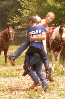 | This is Sam, I am, giving his horse a swimming lesson. Don't go toooo deep there ole' buddy. And Sam dunking Blake. Good thing that cell phone is waterproof!! |
